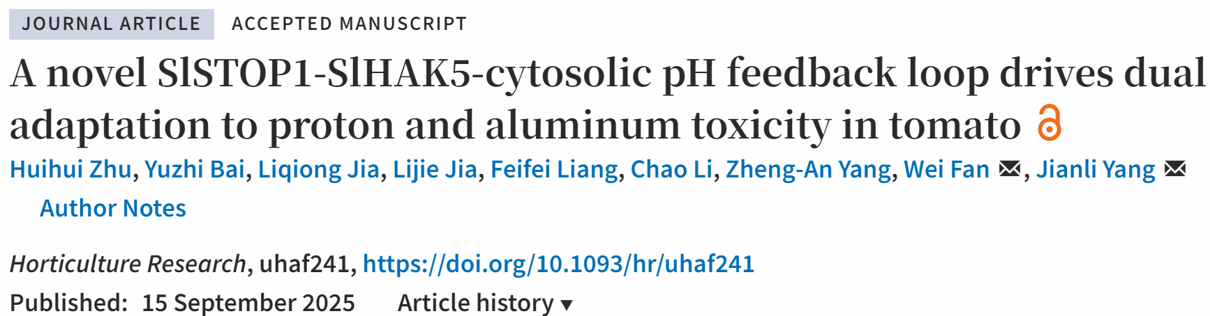 学校杨建立团队揭示番茄slstop1-slhak5抗酸铝的反馈调节机制