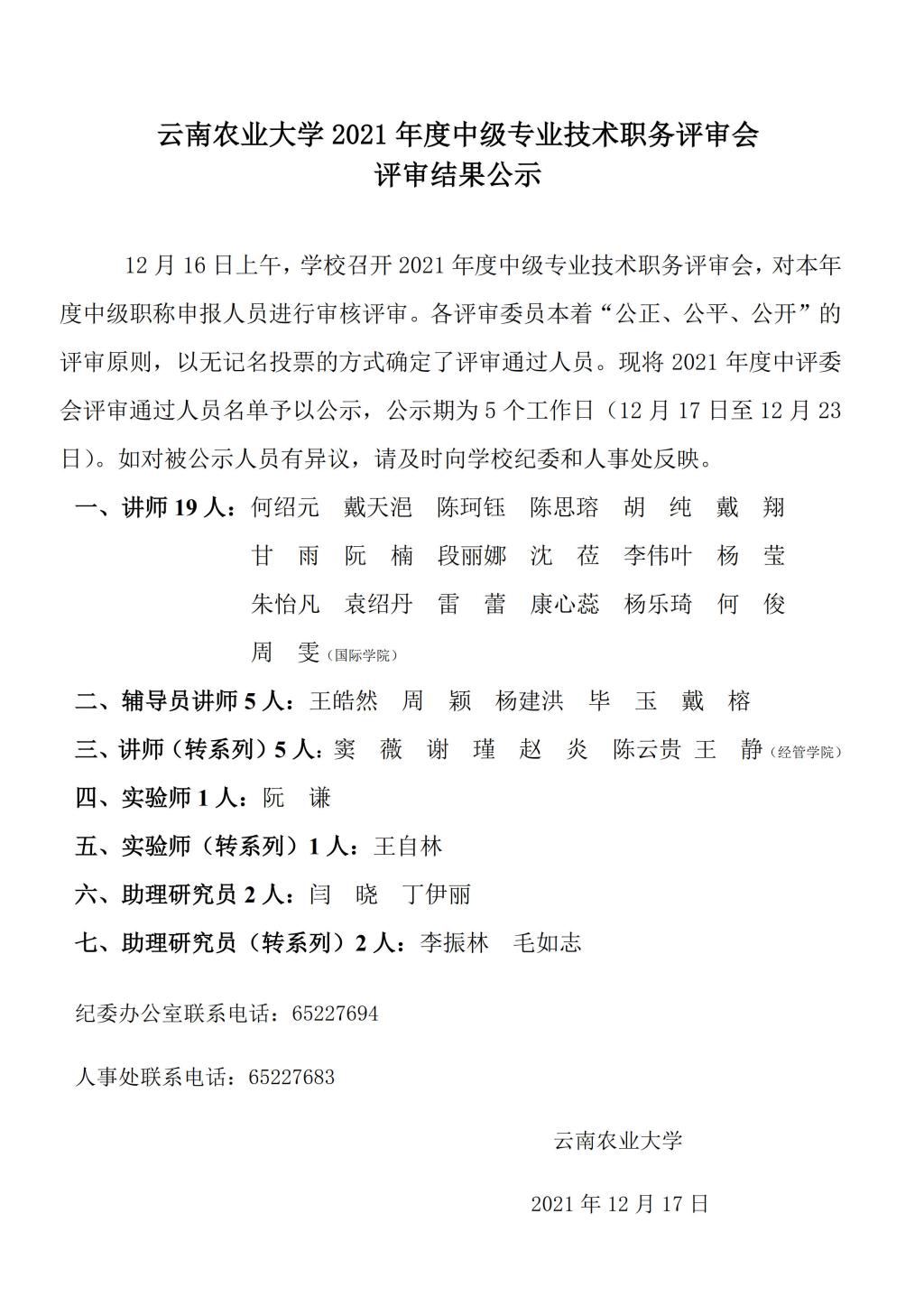 云南农业大学2021年度中级专业技术职务评审会评审结果公示-凯发真人