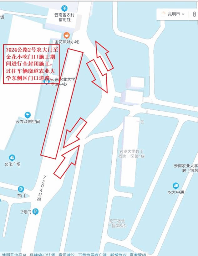 为加快推进7204公路提升改造段施工进度,经昆明市盘龙区住房和城乡建设局申请,昆明市公安局交通警察支队审批同意,施工单位将于2022年10月24日在学校东、西校区大门口7204公路“农大2号门至金花小吃店门口段”进行熔断封闭施工,请过往人员、车辆绕道云南农业大学东校区门口路段。施工单位将在绕道路段起止点设置各种“安全警示标语”和“道路引导箭头”,在交通高峰期段组织2人对过往车辆进行疏散引导。计划用25个工日天完成建设任务并恢复原路面通行。