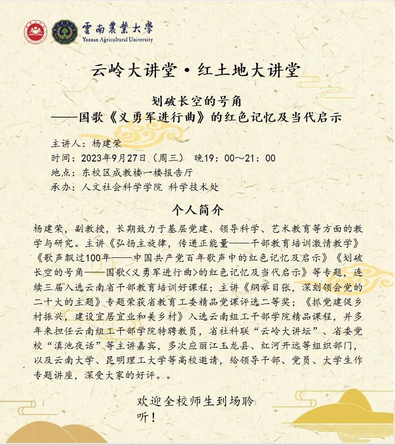 9月27日云岭大讲堂·红土地大讲堂:划破长空的——国歌《义勇军进行曲》的红色记忆及当代启示