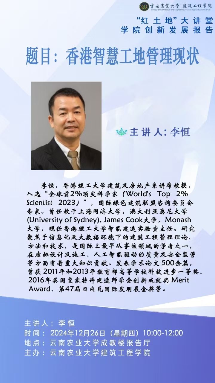 李恒,博士,香港理工大学建筑及房地产系讲席教授,博士生导师,入选“全球前2%顶尖科学家(world's top 2% scientist 2023)”,国际绿色建筑联盟咨询委员会专家。曾任教于上海同济大学、澳大利亚悉尼大学(university of sydney)、james cook大学、monash大学,现任香港理工大学智能建造实验室主任。研究聚焦于信息化及大数据环境下的建筑工程管理理论、方法和技术,是国际上最早从事该领域的学者之一,在虚拟设计及施工、人工智能驱动的质量及安全监管等方面有着重大知识贡献。发表学术论文500余篇,曾获2011年和2013年教育部高等学校科技进步一等奖、2016年英国皇家特许建造师学会创新成就奖merit award、第47届日内瓦国际发明展金奖等。