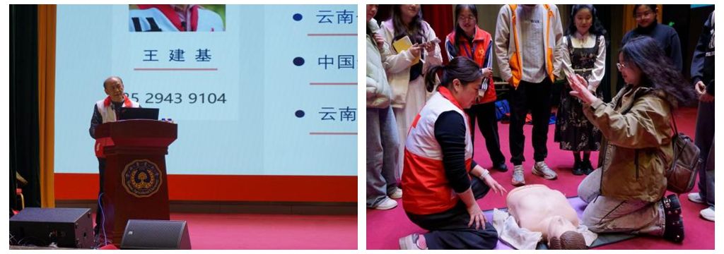 王建基老师通过理论与实操相结合的方式,为师生进行了深入细致的授课。在理论教学环节,他强调了急救知识普及的紧迫性,并围绕红十字运动与中国红十字事业、常见急症、创伤与意外、心肺复苏等内容,结合丰富案例进行了讲解。在实操环节,他就常见急症和意外伤害、心肺复苏(cpr)、自动体外除颤器(aed)使用等方面,进行了演示和指导。