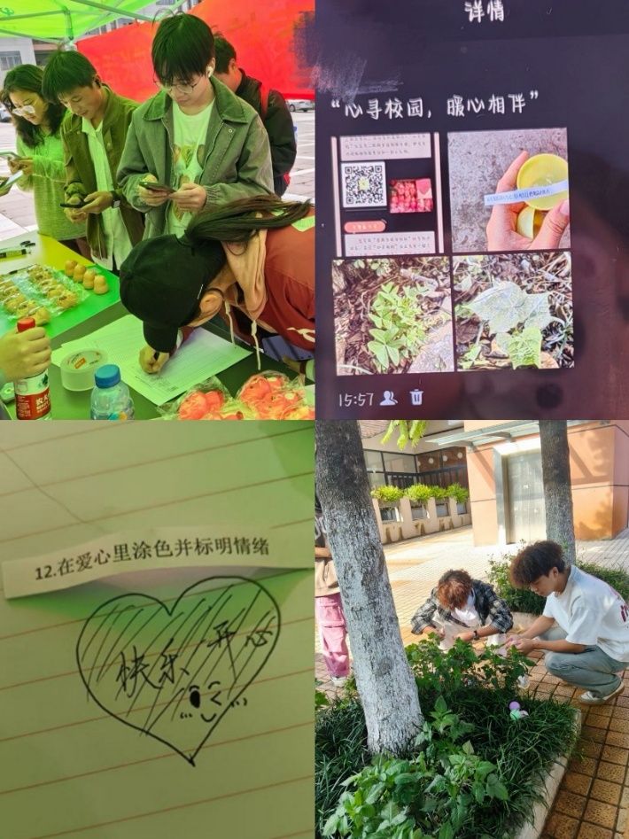 此次活动以“趣味探索 情绪互动”为主线,参与同学根据线索在校园中寻找任务小球,既支持个人探索,也鼓励团队协作,完成包括“用树叶拼心形”“寻找‘笑脸’井盖”“双人比心框景”等52项创意任务,并通过拍照、分享朋友圈等方式记录过程。活动摊位还提供情绪互动角,同学们可在爱心卡片上涂色、书写心情与成就,或折叠爱心传递温暖,有效增进了大家的交流与情感联结。此外,现场还设置了“朋友圈集赞赢好礼”环节,激发了同学们的参与热情。今后心理健康教育与咨询中心将持续开展更多兼具趣味性与治愈特色的心理活动,为同学们的校园生活注入温暖与活力。