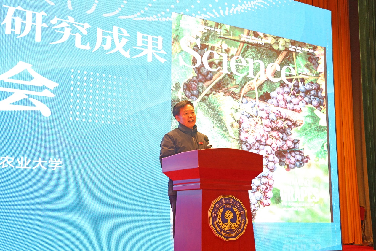省科技厅厅长王学勤主持会议并作研究成果发布。省教育厅副厅长王永全到会并讲话。校长李永和致辞,董扬教授代表团队作研究成果报告,盛军教授、朱怡凡博士回顾和展望葡萄资源研究历程,介绍相关成果转化创新研究情况,朱有勇院士作了专家点评,学校党委书记黎素梅向董扬教授团队授予“葡萄生物资源和品种创新研究资金”。